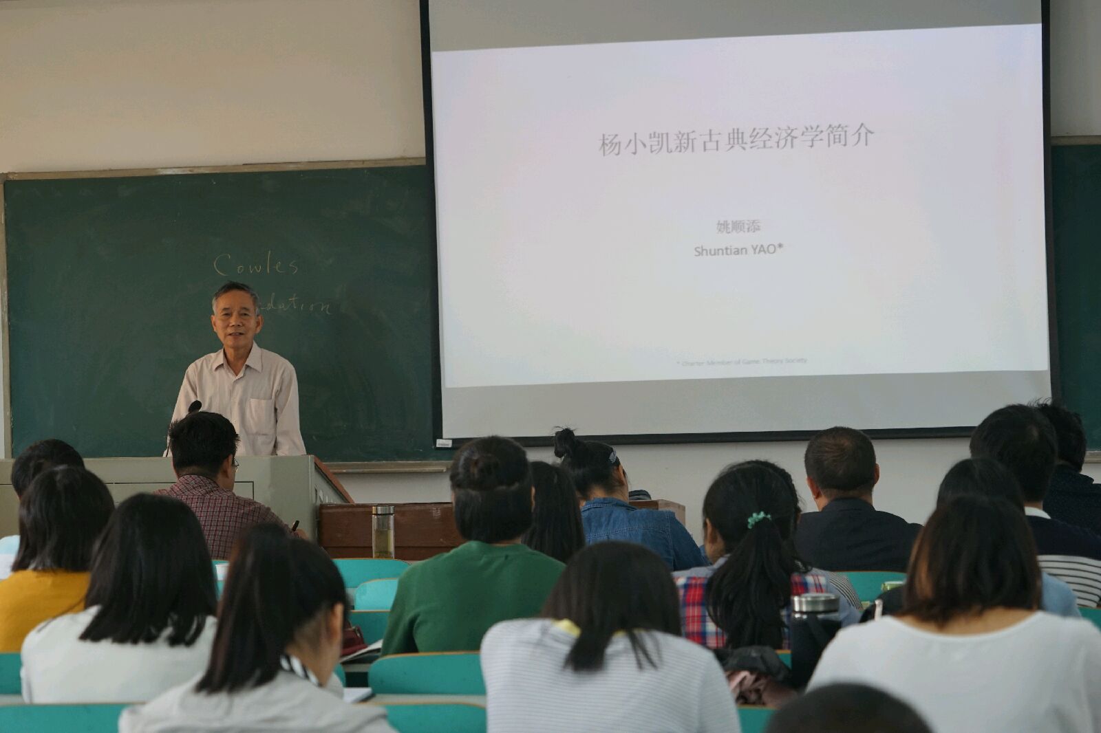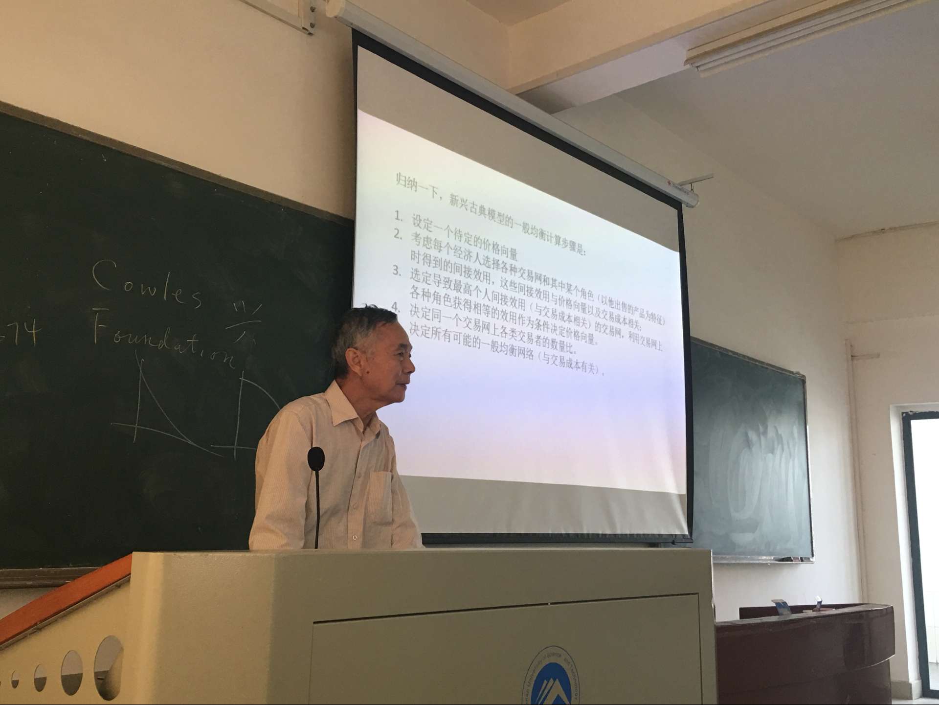 讲座中,姚教授详细介绍了杨小凯新兴古典经济学,认为其主要理论是以一般均衡论为基础。由于其理论不需要凸性假设,即使存在交易成本,均衡在大经济的条件下依然存在。姚教授还就新兴古典一般均衡的存在性进行了讲解。