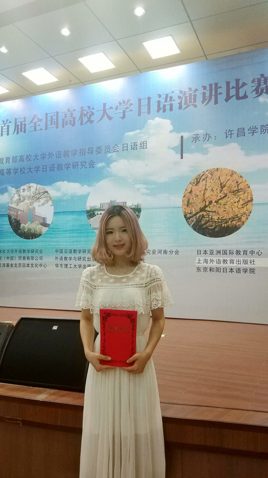 9月23日首届全国高校大学日语演讲比赛在河南许昌学院举行,我校维多利亚vic115优惠大厅15级旅游管理专业赵勤同学荣获全国二等奖。