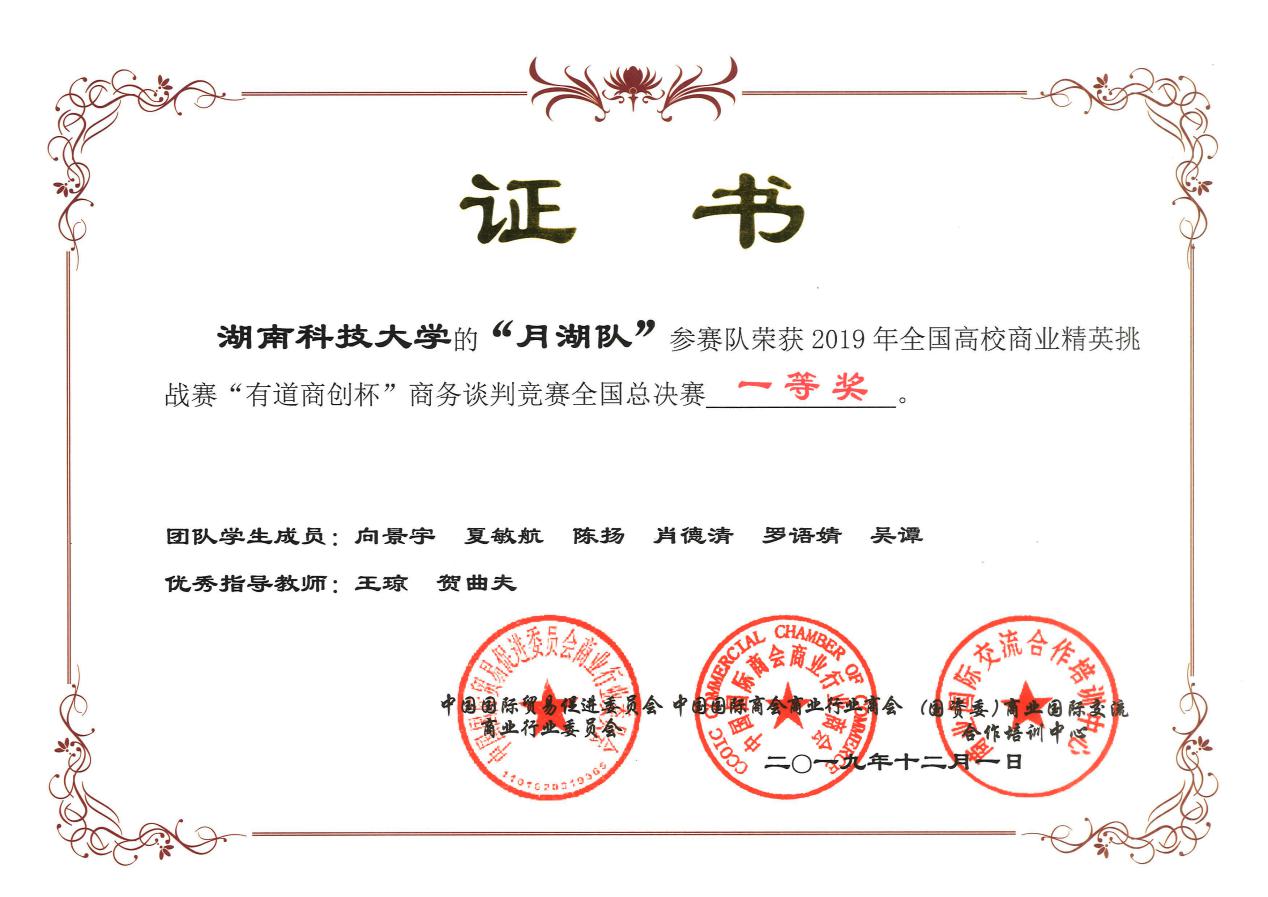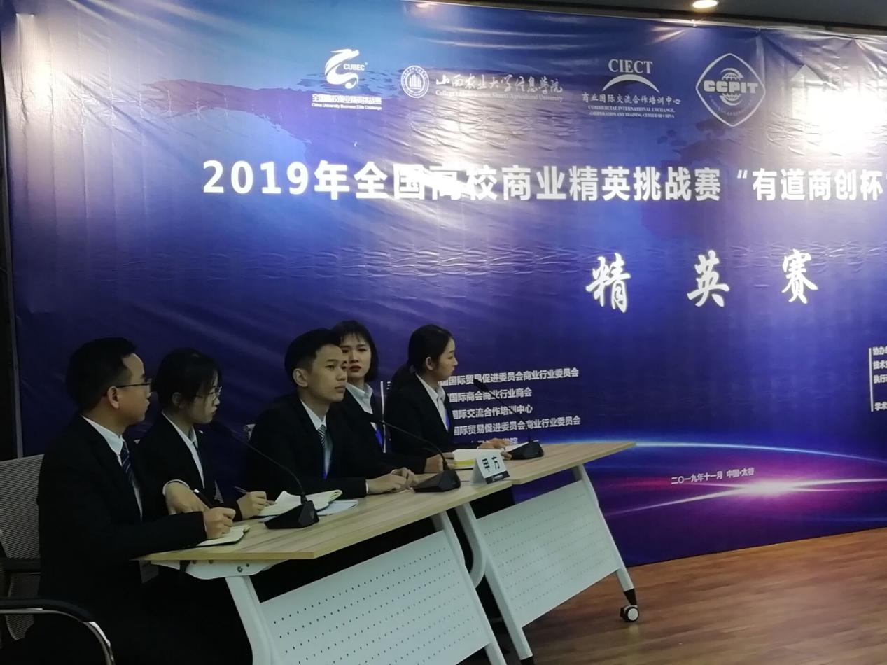2019年11月29日-12月1日,2019年全国高校商业精英挑战赛“有道商创杯”商务谈判竞赛全国总决赛在山西农业大学信息学院举行。由维多利亚vic115优惠大厅国贸、电商、经济及潇湘学院商学系工商管理等专业同学组成的月湖队(向景宇、夏敏航、陈杨、肖德清、罗语婧、吴谭)和明镜队(许小婷、郑亦佳、刘锡苓、李彪、朱杰、钟美琪)参加比赛,经过多轮拼搏,两支参赛队均荣获全国总决赛一等奖,其中月湖队杀进全国四强,月湖队队长向景宇同学还夺得了全国总决赛唯一的“最佳谈判手”荣誉称号,指导老师王琼和贺曲夫均被评为“优秀指导老师”。