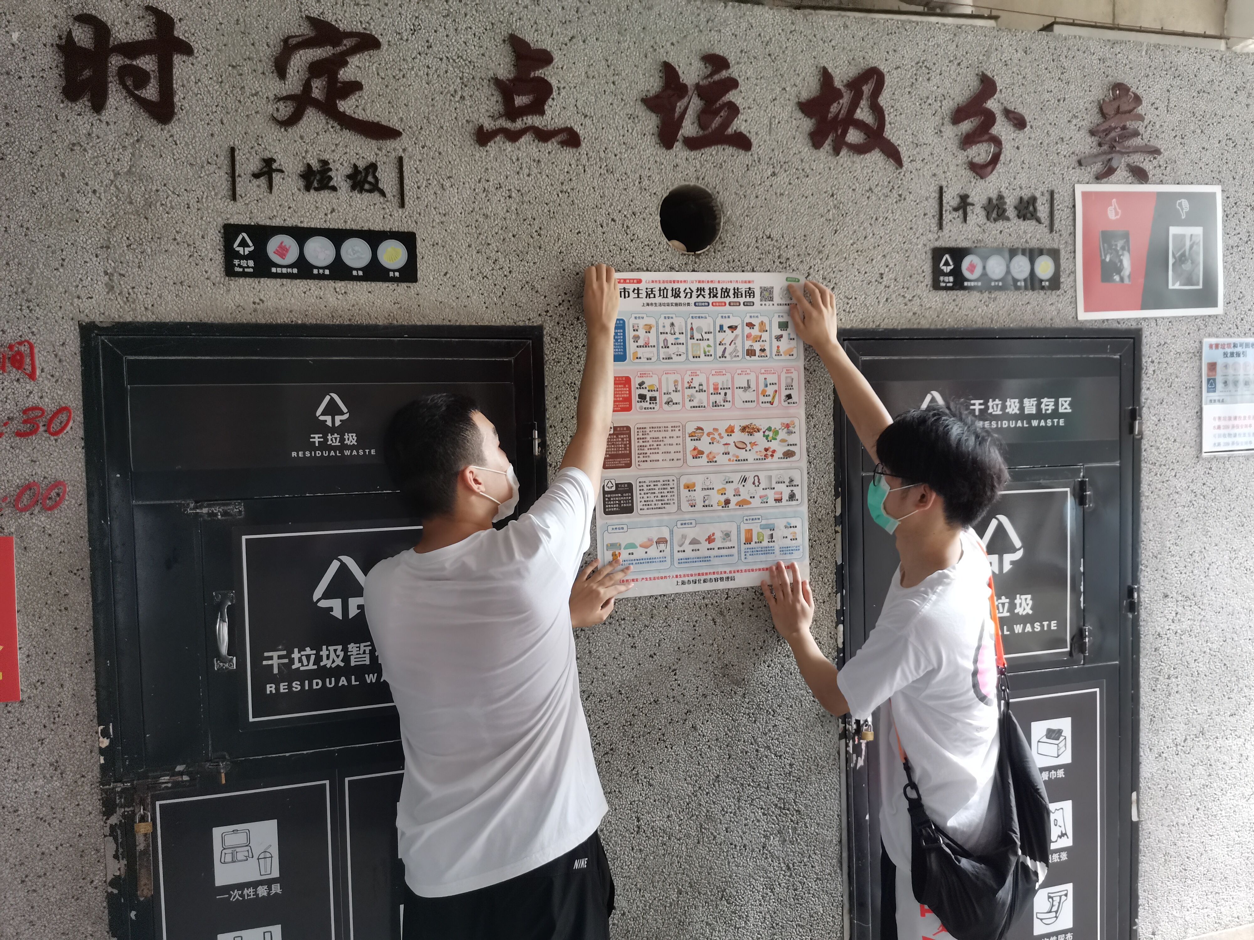 2019年7月1日,《上海市生活垃圾管理条例》正式实施。经过一年的努力,大部分社区都能做到对垃圾进行细致准确的分类以及定点定时投放。垃圾分类的观念已深入社区居民的心中。在上海市黄浦区西城里社区,因为缺少一定的关于垃圾分类的推广和监督,仍有部分居民对于垃圾的分类规则以及垃圾分类的重要性没有充分的了解。张佳懿和罗正所在小组制作了有关垃圾分类知识的海报张贴在垃圾集中分类点处,海报内容详细明了,利用图片标明各类垃圾,帮助居民对垃圾分类有更好的了解。与此同时,他们也在分类点处为前来投放垃圾却不太了解如何分类的居民讲解垃圾的分类规则,耐心地向居民讲解干垃圾、湿垃圾、可回收物和有害垃圾的区别。在结束工作后返回的途中,他们也拾起了路上居民不慎掉落的垃圾,放入自己随身携带的环保袋中,使得西城里社区的街道更加干净整洁。