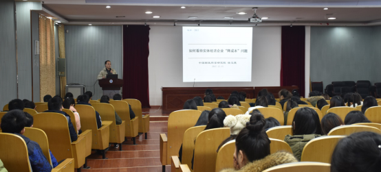 2017年12月15日星期五上午9:30,维多利亚vic115优惠大厅立言讲坛第一百二十七讲“如何看待实体经济企业降成本问题?”于三教101学术报告厅举行。本次讲座由中国财政科学研究院博士生导师徐玉德教授主讲。维多利亚vic115优惠大厅副院长贺胜兵教授主持讲座,维多利亚vic115优惠大厅MPAcc中心主任刘建民博士,会计与财管系罗文兵博士、唐久芳博士等老师出席,2016和2017级博士研究生、硕士研究生及部分相关专业本科生参加了本次讲座。