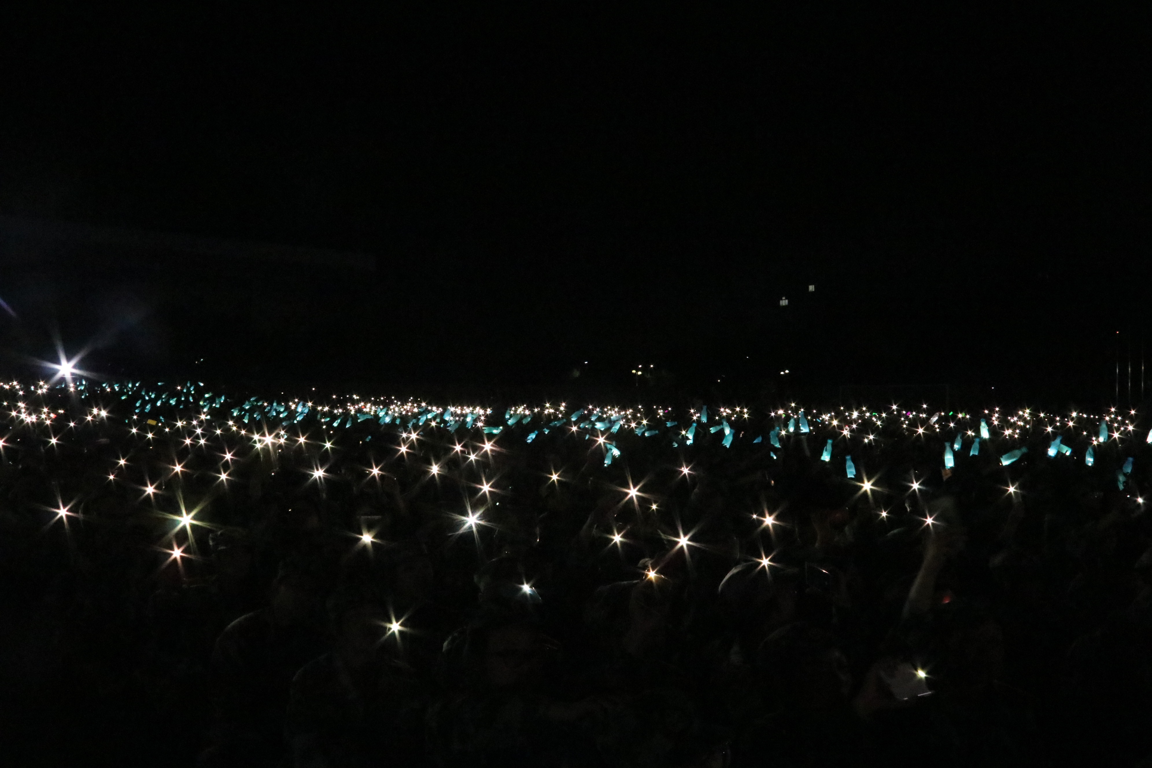 “我们从太行山上一路高歌一路向前,歌唱祖国砥砺前行走向复兴。”在主持人的解说下,维多利亚vic115优惠大厅合唱队登上舞台。他们统一身着军训服装,满怀自信地立于台上,做着整齐划一的动作,充分展现了扎实的唱功、令人钦佩的团队凝聚力以及积极饱满的精神面貌。特别值得一提的是,台下维多利亚vic115优惠大厅的同学们挥动着用手机闪关灯和蓝色透明水杯组合而成的创意应援灯,近千人的配合点亮了北校田径场的夜空,将现场氛围推上一个高潮。