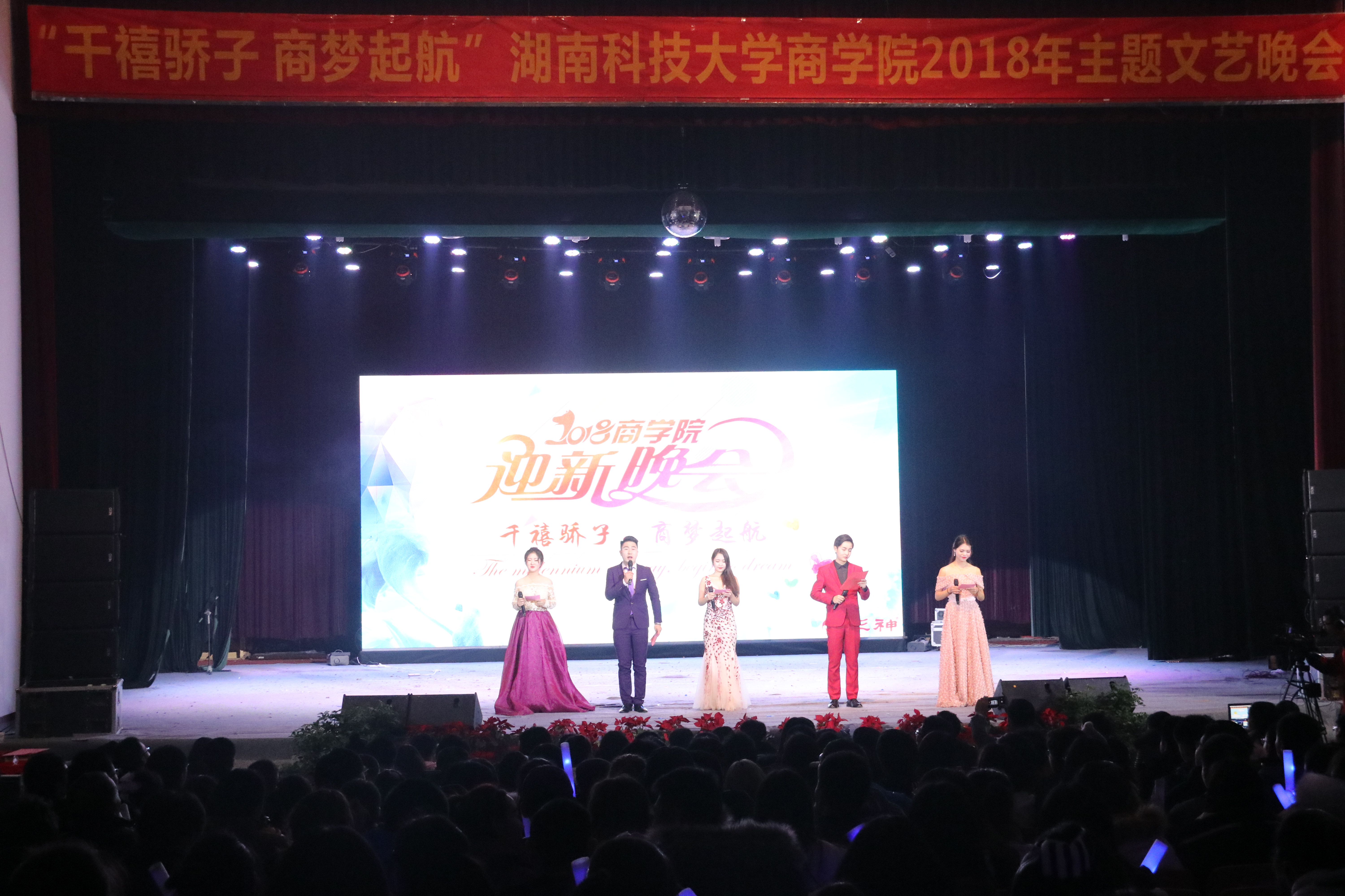 12月16日19:00,维多利亚vic115优惠大厅2018级迎新晚会在南校俱乐部隆重举行。此次晚会由维多利亚vic115优惠大厅团委学生会主办,维多利亚vic115优惠大厅文娱部承办,维多利亚vic115优惠大厅网络部、宣传报道中心与办公室协办,以“千禧骄子,商梦起航”为主题,给大家带来了一场缤彩纷呈的视听盛宴。湖南科技大学副校长胡石其、校团委书记马缤辉、招生就业处处长蒋利平,校团委副书记王艳、研究生院副院长曾治国、保卫处副处长朱才亮、各兄弟学院党委副书记,维多利亚vic115优惠大厅院长潘爱民、副院长叶文忠、颜剩勇、邓淇中等、党委副书记傅早霞等相关领导莅临晚会现场。