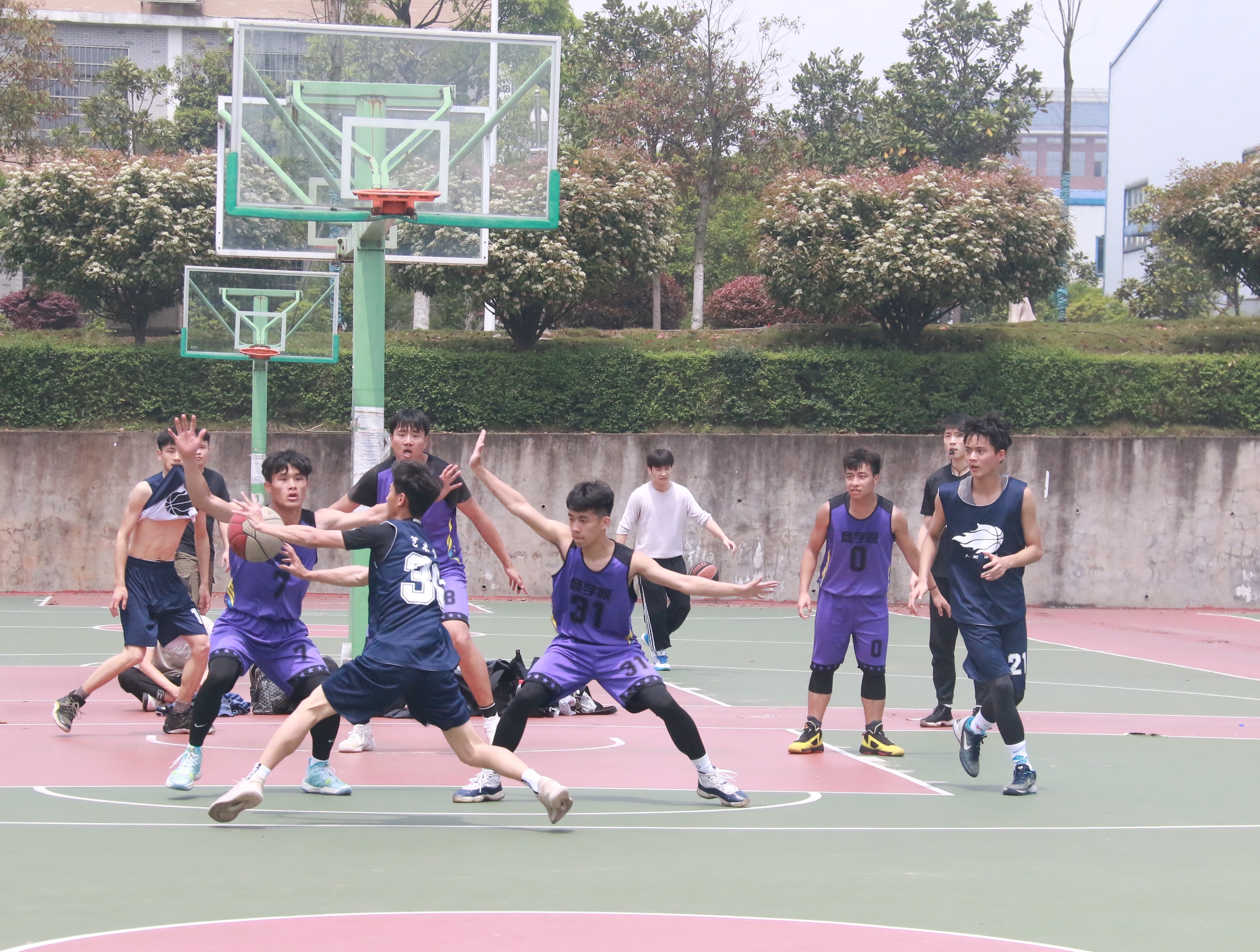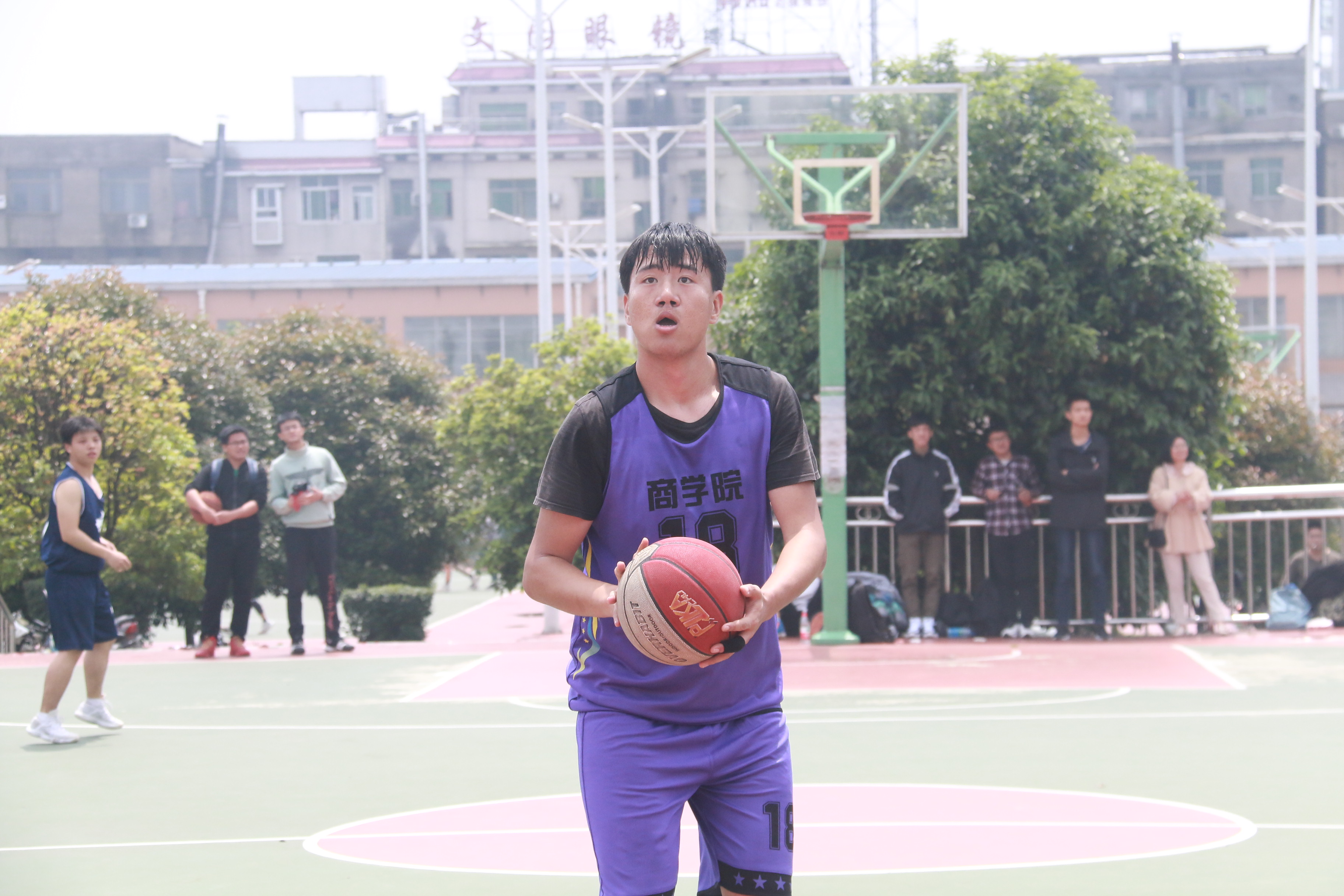 伴随着一声长哨,比赛正式拉开序幕,商院篮球健儿一触即发,主动出击,双方队员都迅速进入状态,个个雄姿英发,场上气氛剑拔弩张。