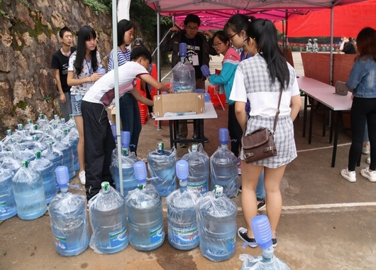 搭建好服务台,分配好工作,值班干部今天的工作正式开始。文娱部副部长柯毅抬起一桶矿泉水来到三营二连六排训练场地后方,六排有不少伤病员,尽管不能坚持军训,但他们也没有闲着,见到值班干部抬水过来马上起身帮忙,一起为大家的水瓶接水,确保参训同学在休息时间有水喝。柯毅一瓶一瓶地调整水瓶的位置和方向,仔细地检查是否都接满了水,他将一整天蹲点六排,协助助班和教官的工作。