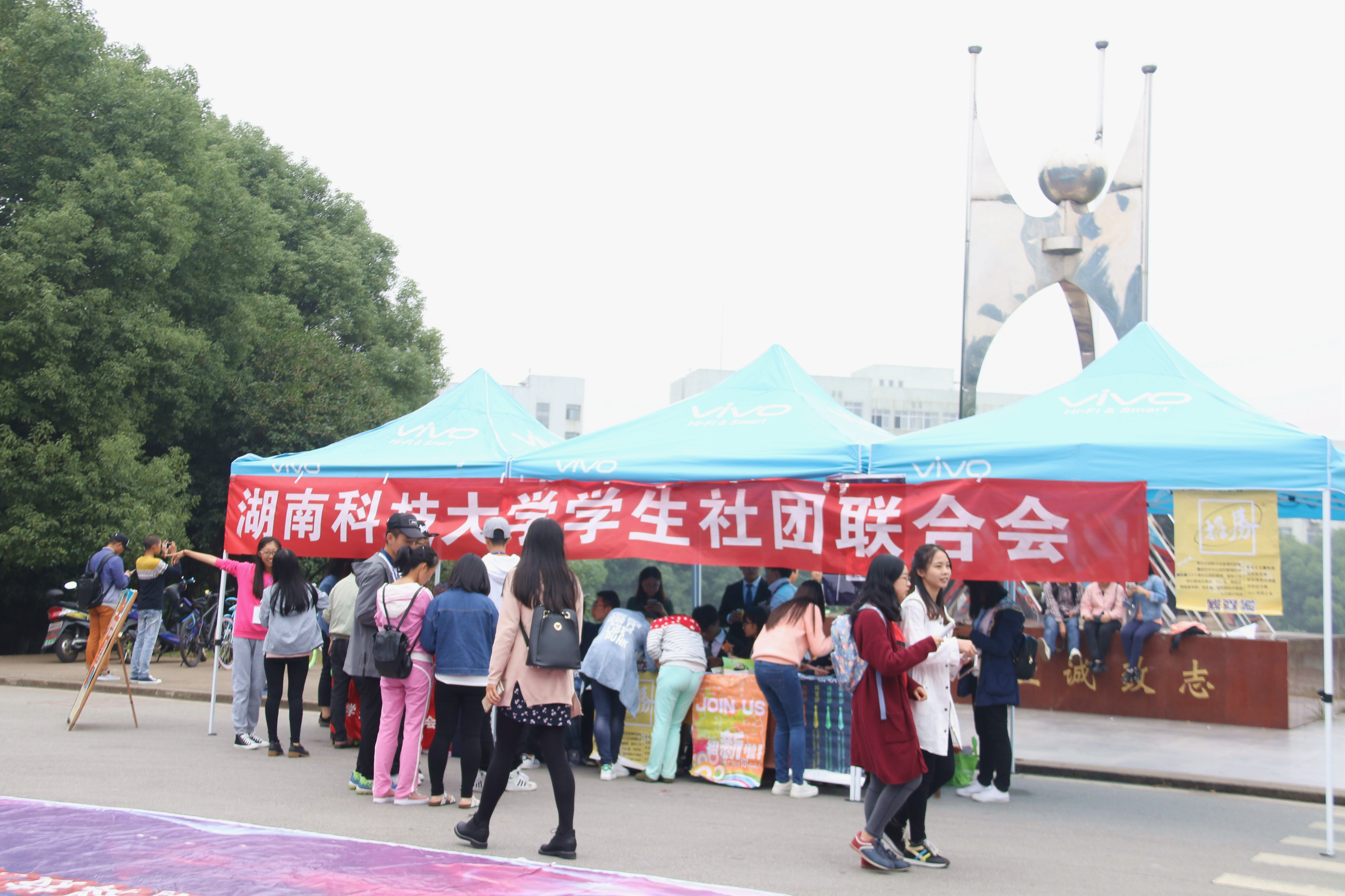 10月15日,湖南科技大学一年一度的“百团招新”在北校八教至樱花园路段盛大开展,此活动由校社团联合会承办,为期两天,共125个社团参与摆点,面向全校16级同学招新。