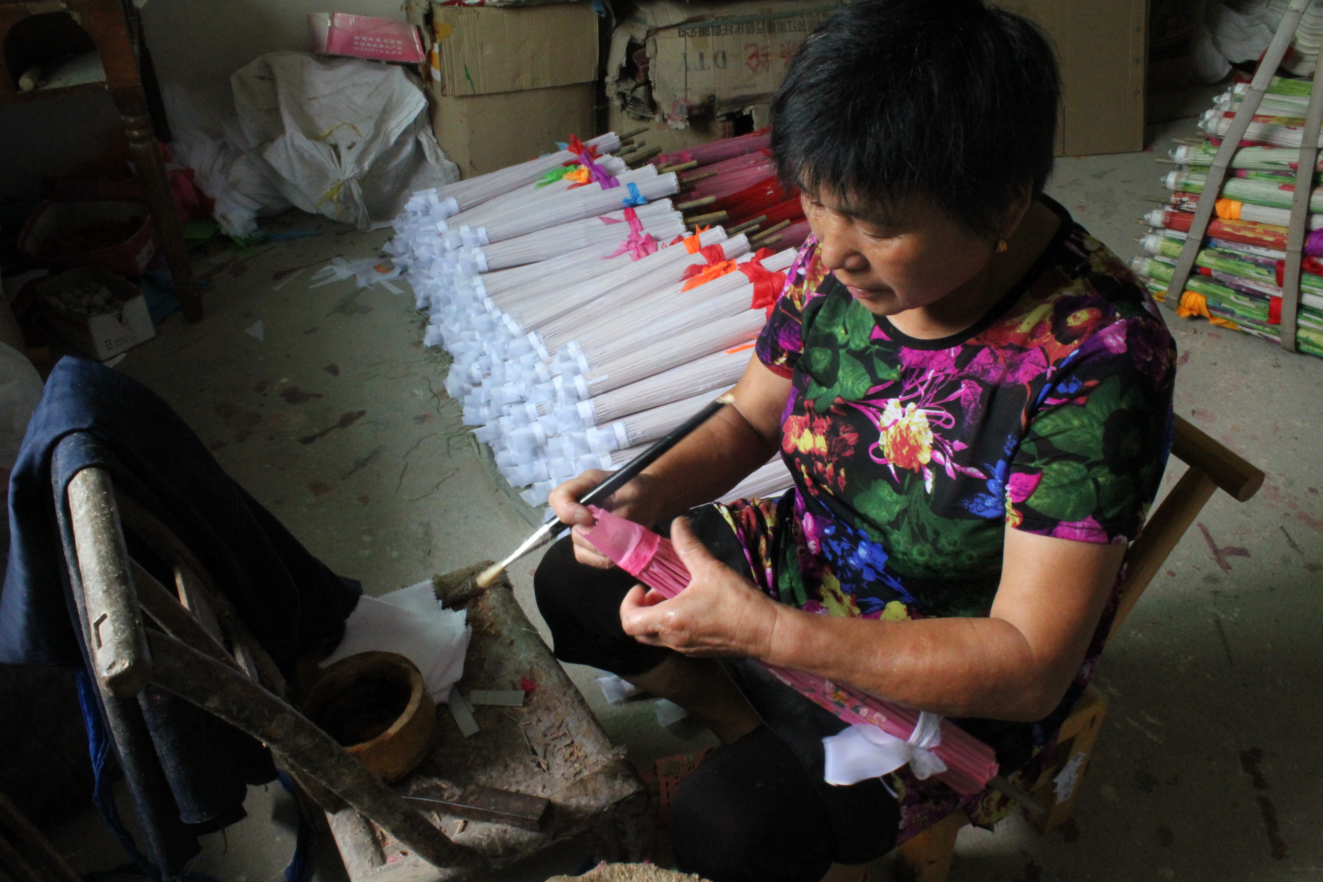 青山之上是烟雾缭绕,青山脚下是幽僻人家。初进周师傅家,竹椅、木桌、刷着铜色漆的大门,堂前是扎放整齐的伞骨,几把色彩亮丽的油纸伞倚靠在墙边。穿过大堂,桐香四溢。一扇通透的窗子,一间吊满油纸伞的屋子里,伞纸缤纷。