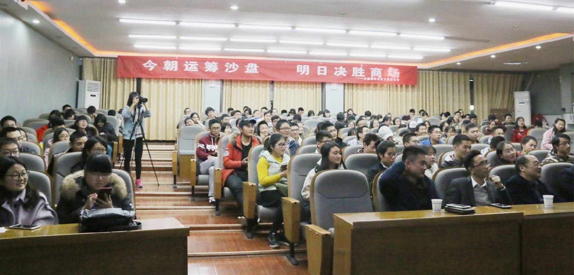 “今朝运筹沙盘,明日决胜商场。”12月18日19:30,2016“蓝星杯”湖南科技大学沙盘模拟经营竞赛颁奖典礼于第三教学楼101拉开了帷幕。此次活动由我校组委会主办,特邀教务处副处长罗建文教授、校团委书记马缤辉博士、学生工作处副处长罗登辉老师、维多利亚vic115优惠大厅副院长邓淇中博士、维多利亚vic115优惠大厅经管实验中心主任童杰成老师等作为嘉宾出席此次典礼。