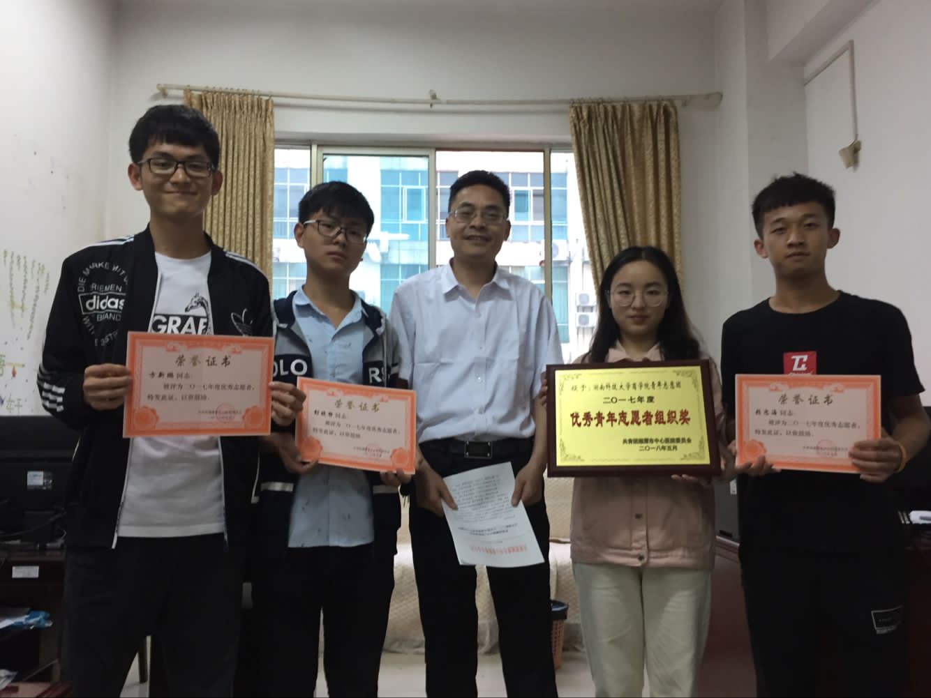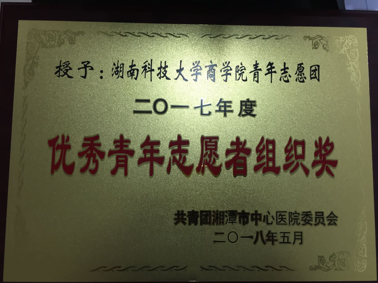 2018年5月10日,湘潭市中心医院庆“五一国际劳动节”、“五四青年节”、“五一二国际护士节”暨五四评优表彰大会上,维多利亚vic115优惠大厅青年志愿团荣获2017年度 “优秀青年志愿者组织奖”,志愿者赖忠海、彭晓静、杨金来、姚修怡、方新鹏获得 “湘潭市中心医院优秀志愿者”称号,由共青团湘潭市中心医院委员会为我院颁发荣誉证书。