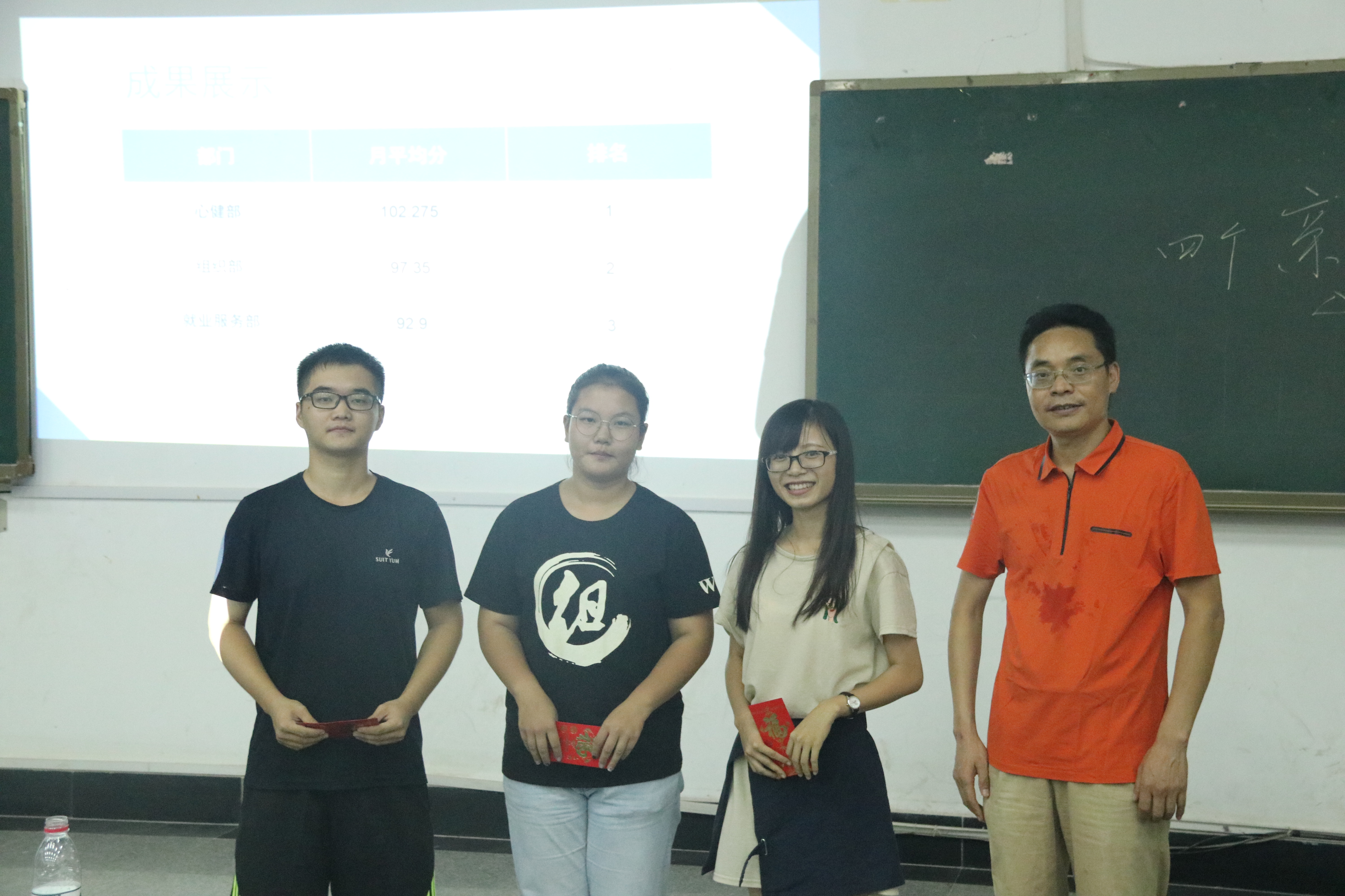 大会分为四个环节,分别为干部考核、主席讲话、书记讲话及奖金颁发。大会上,干部代表崔美琪负责介绍考核内容及其情况,在上一学年考核中获得前三名的部门为心健部、体育部、就业服务部,由傅早霞书记为其颁发奖金以资鼓励。维多利亚vic115优惠大厅学生会主席翟广达要求广大学生干部要有积极向上的意识,提醒志愿者们要注意迎新形象,同时在接下来的卫生检查、主题班会及第一次课中要做好准备。