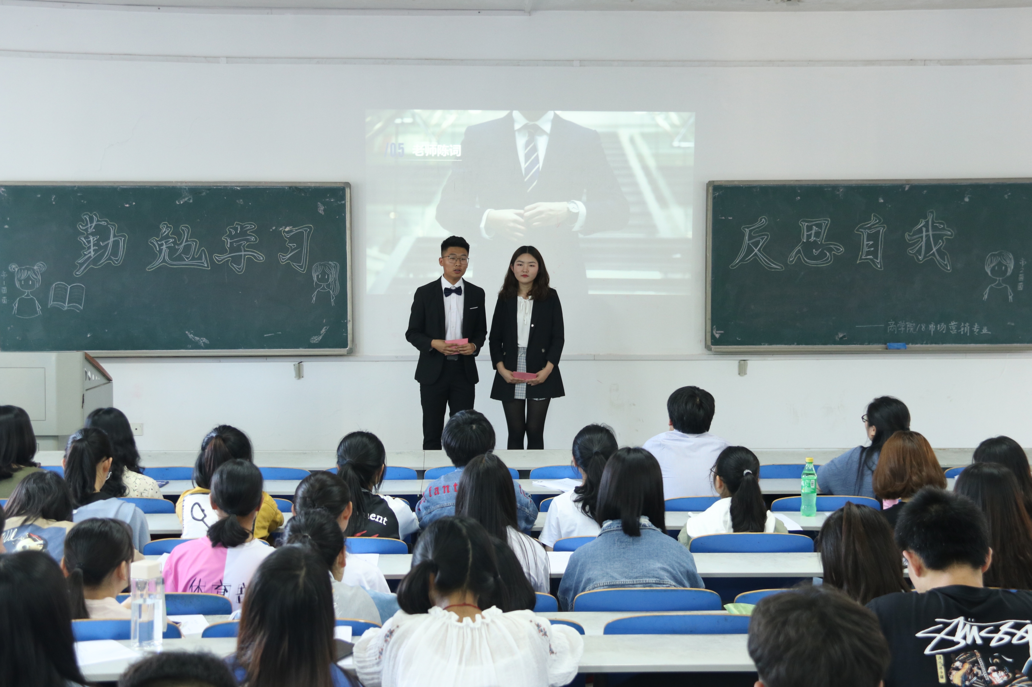 2019年5月10日16:30,维多利亚vic115优惠大厅18年级市场营销专业“勤勉学习,反思自我”主题班会在第一教学楼102教室召开。此次主题班会到场的嘉宾有维多利亚vic115优惠大厅党委书记贺胜兵、党委副书记傅早霞、学工办主任陈攀、18年级辅导员罗江林、18年级市场营销专业班主任韩东初、学助吴思玲和王倩雯。